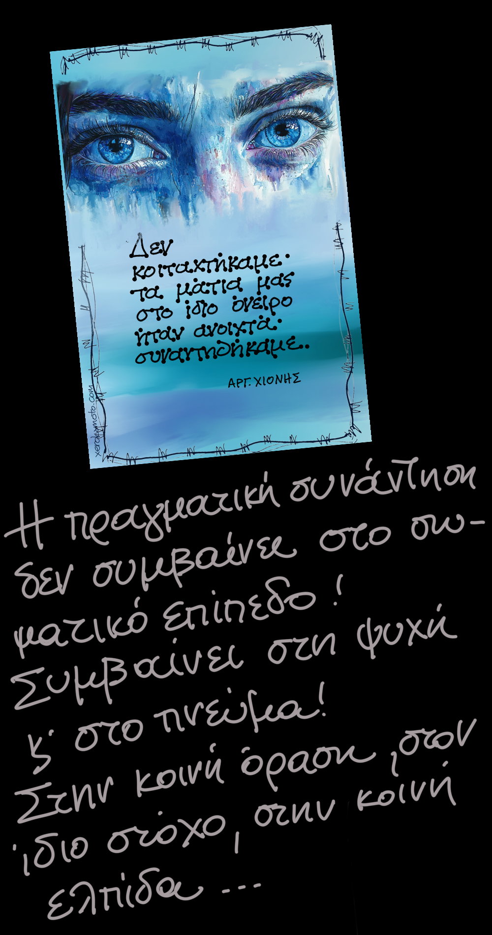 Τα έντονα μπλε μάτια κυριαρχούν, με βλέμμα που δεν κοιτά κανέναν… Με έκφραση που κοιτά πέρα κάπου μακριά ή βαθιά μέσα…. Εκεί συναντιούνται ουσιαστικά οι άνθρωποι!